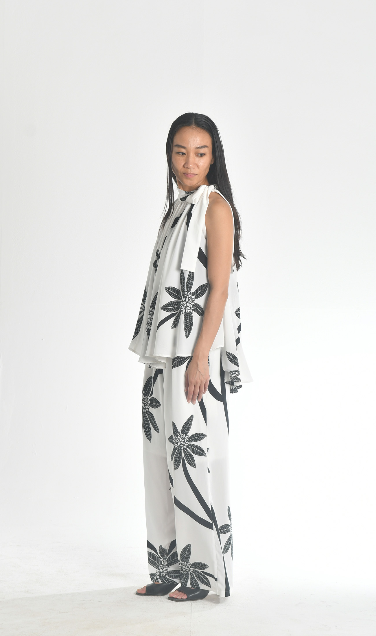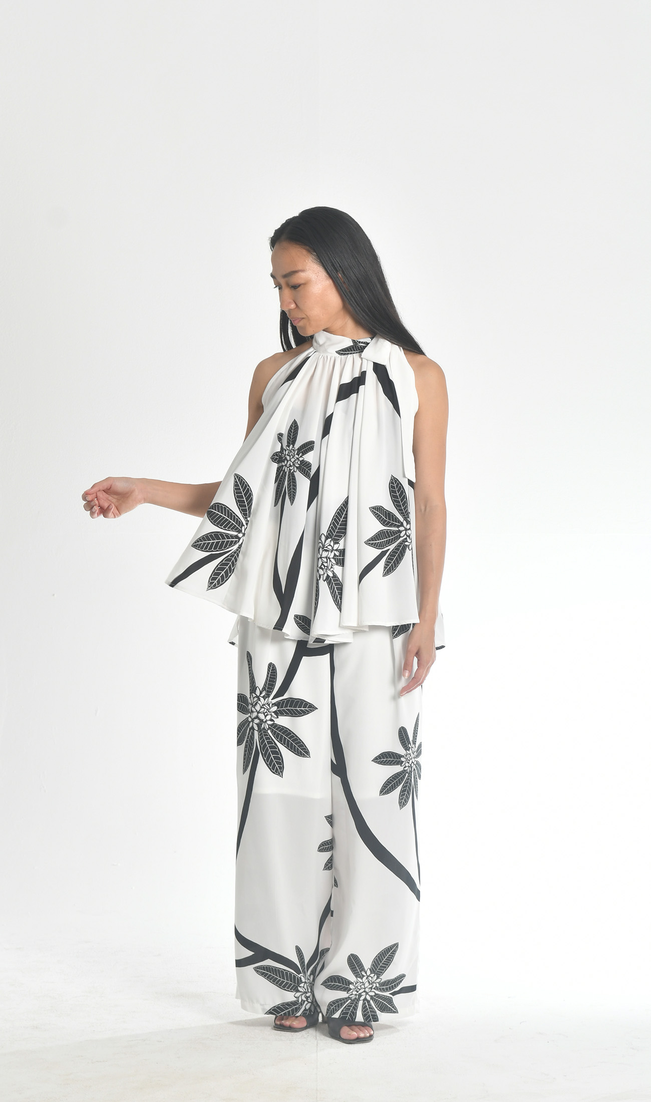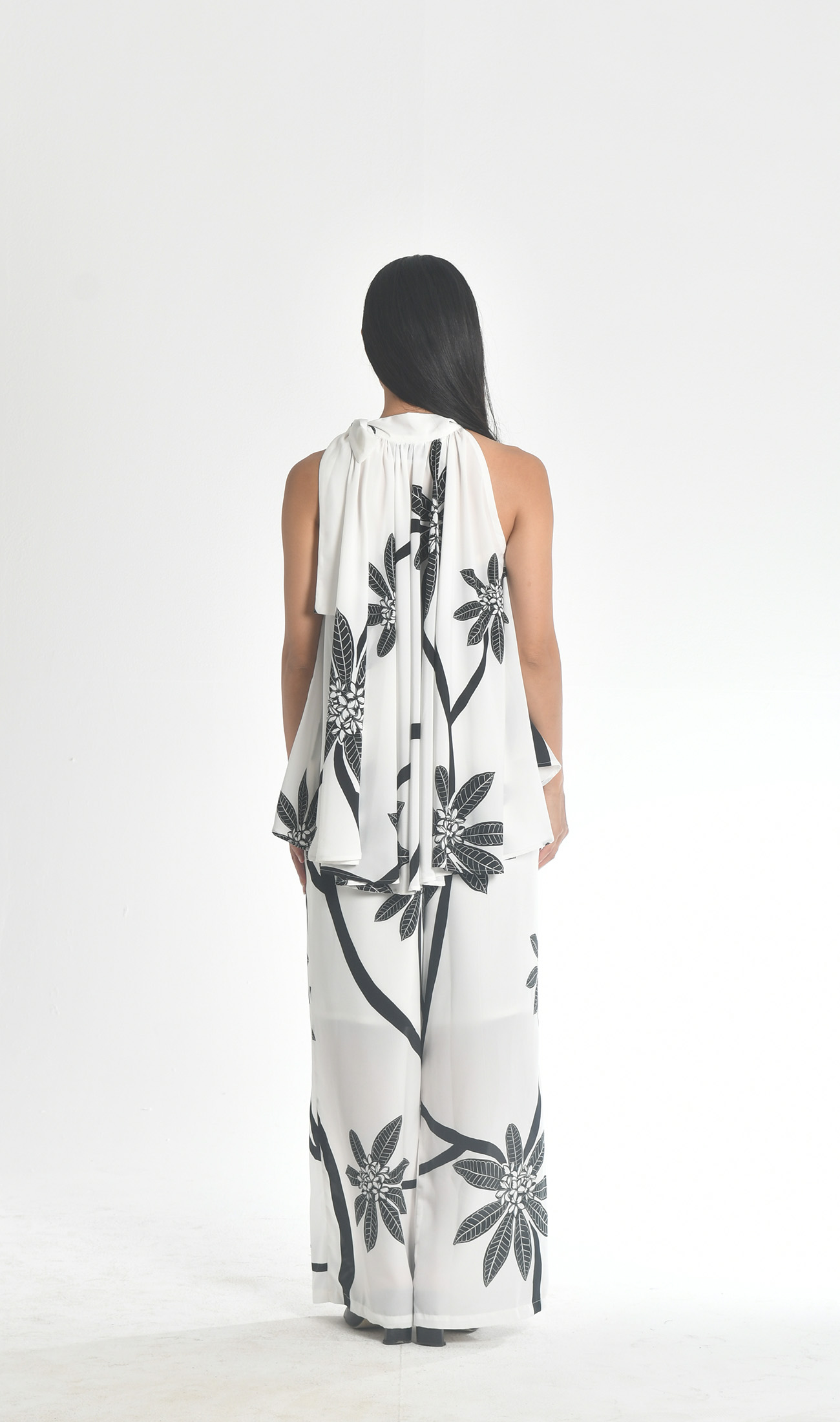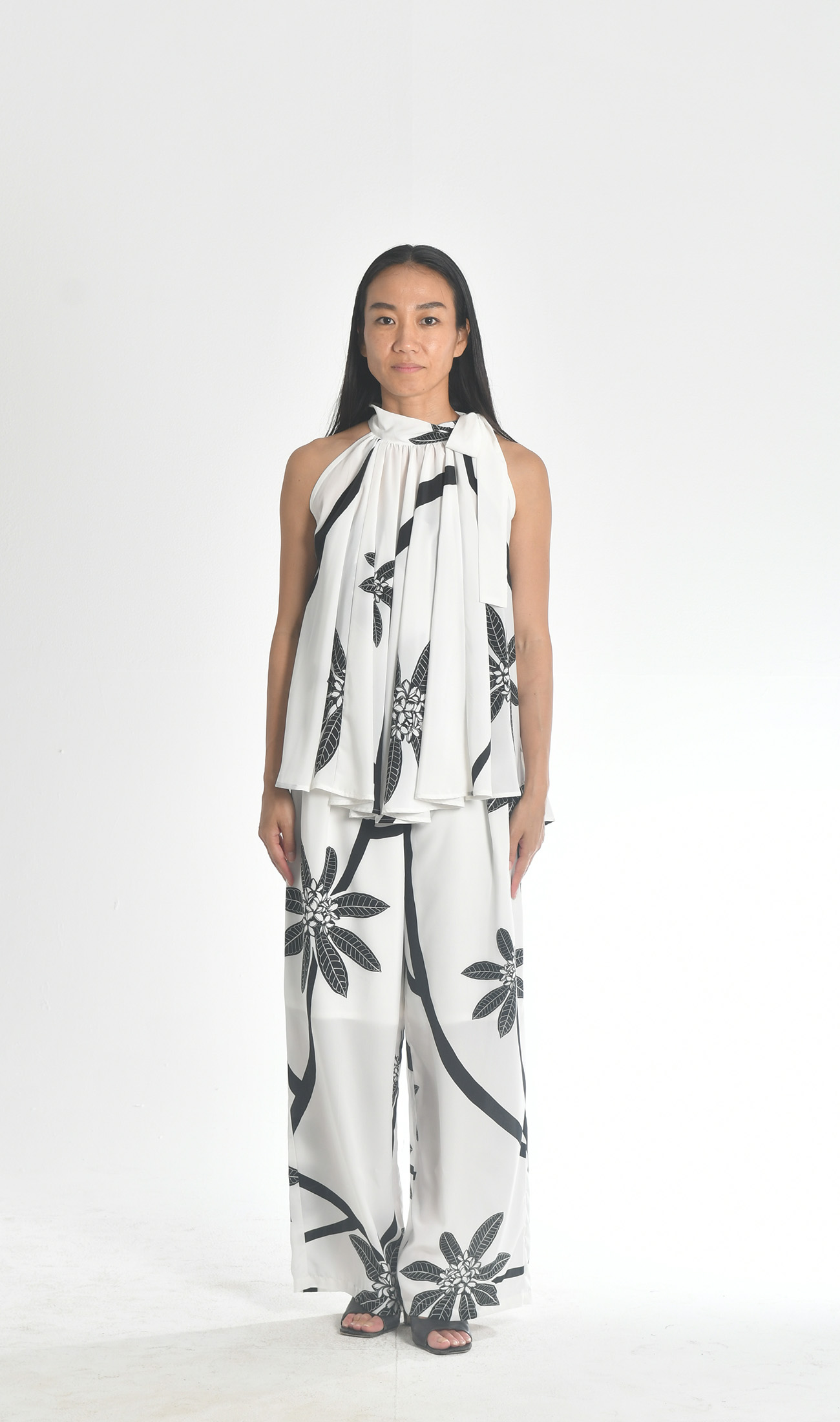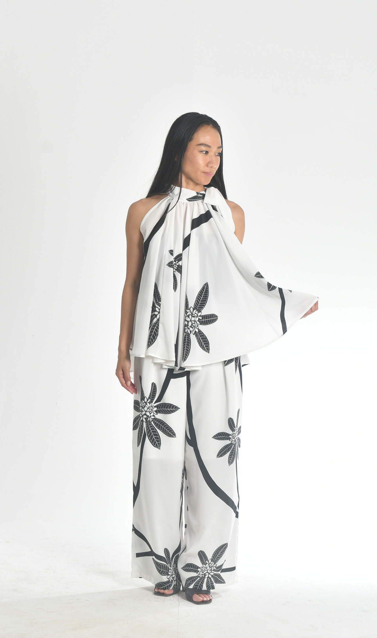 テキスタイル生地をたっぷり使用した贅沢なドレープラインの美しいドレープホルターのトップス。