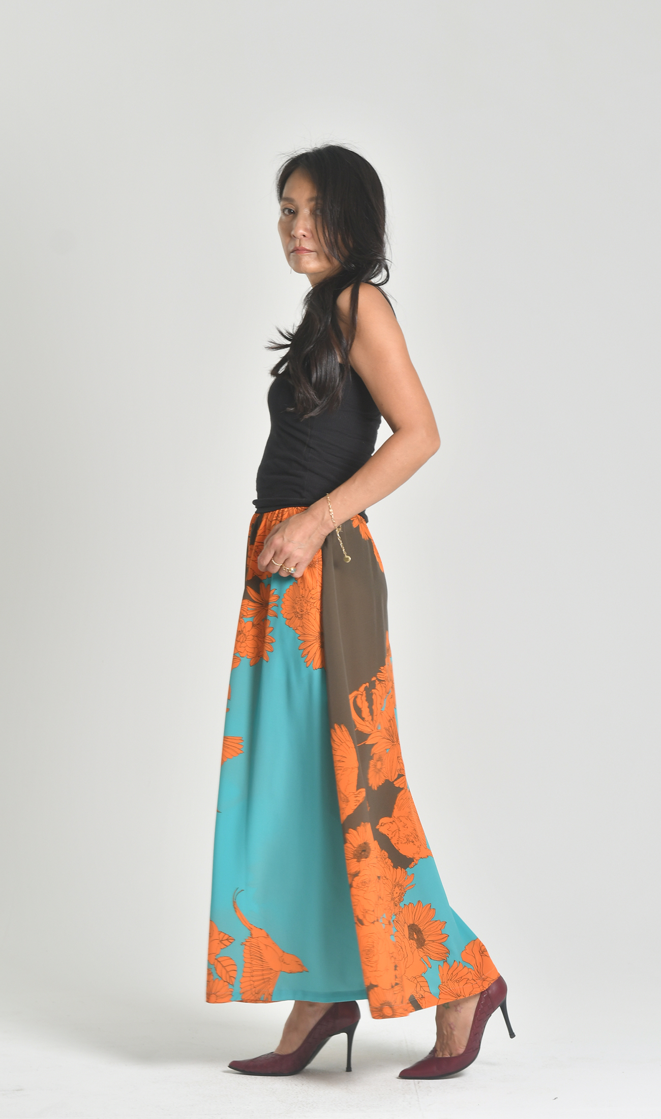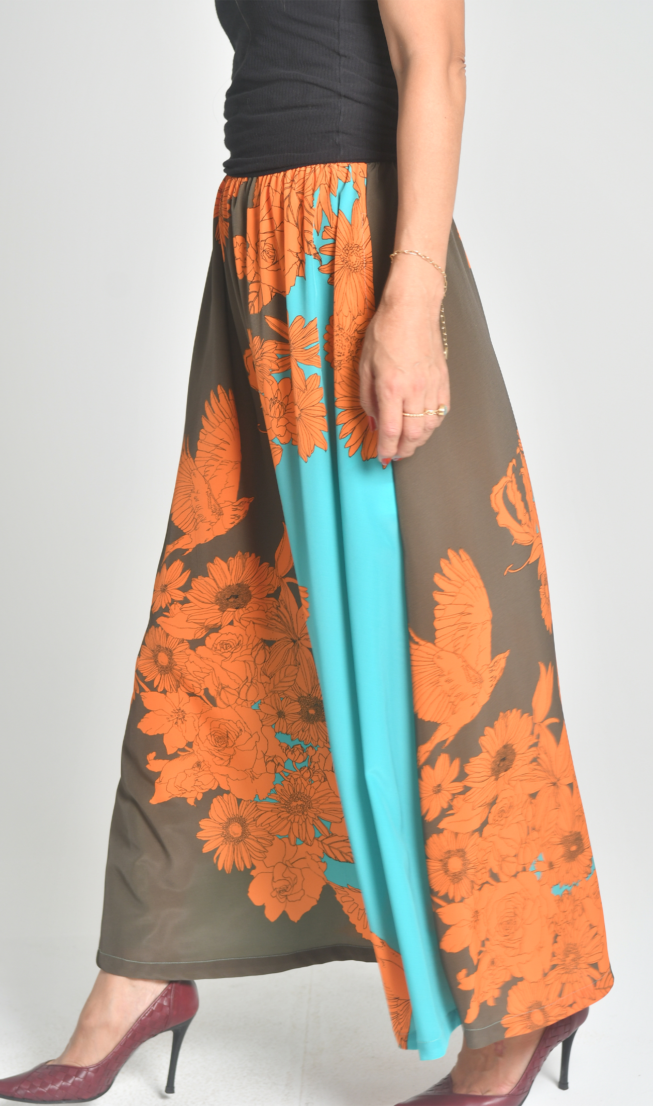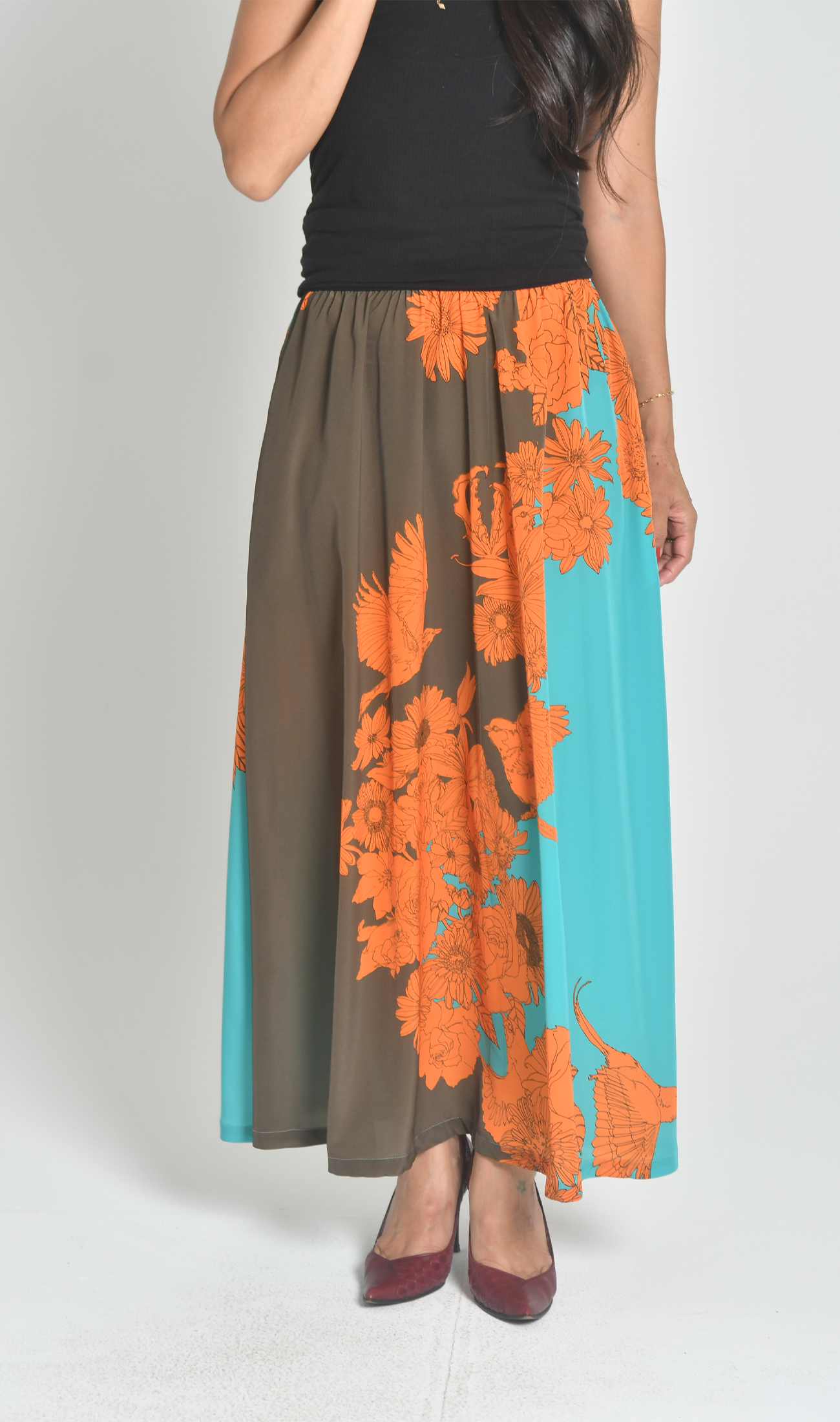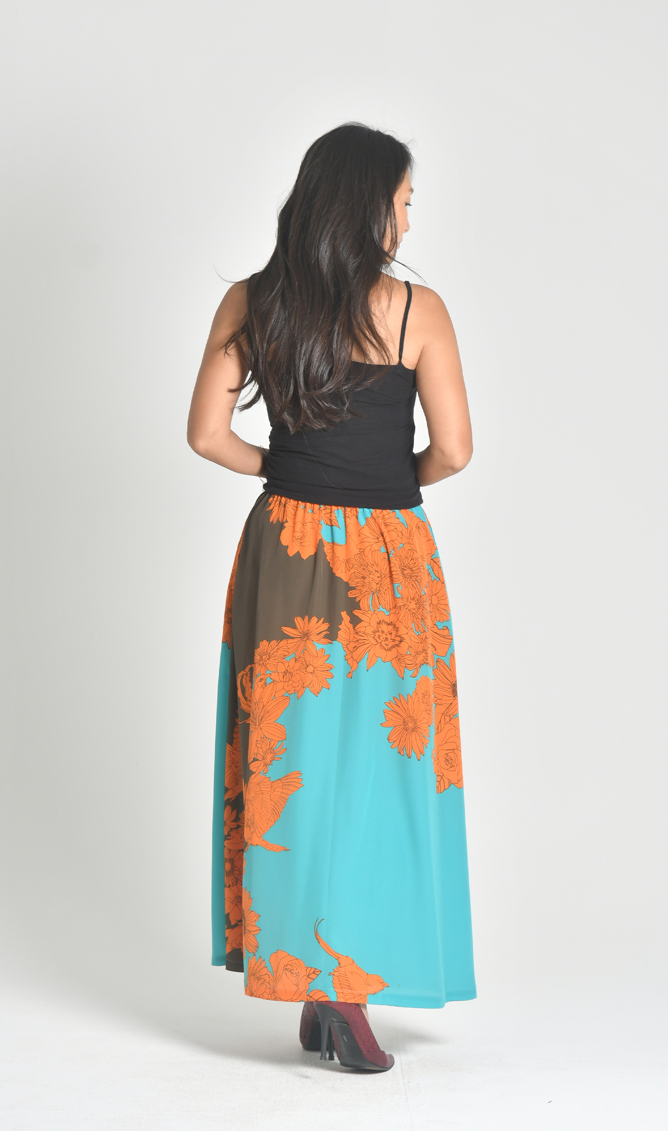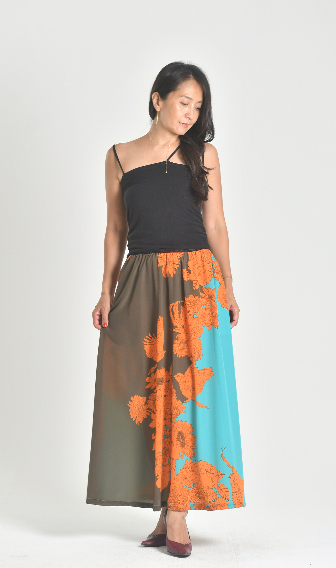 ハイウエストでウエストラインが美しいマキシスカート