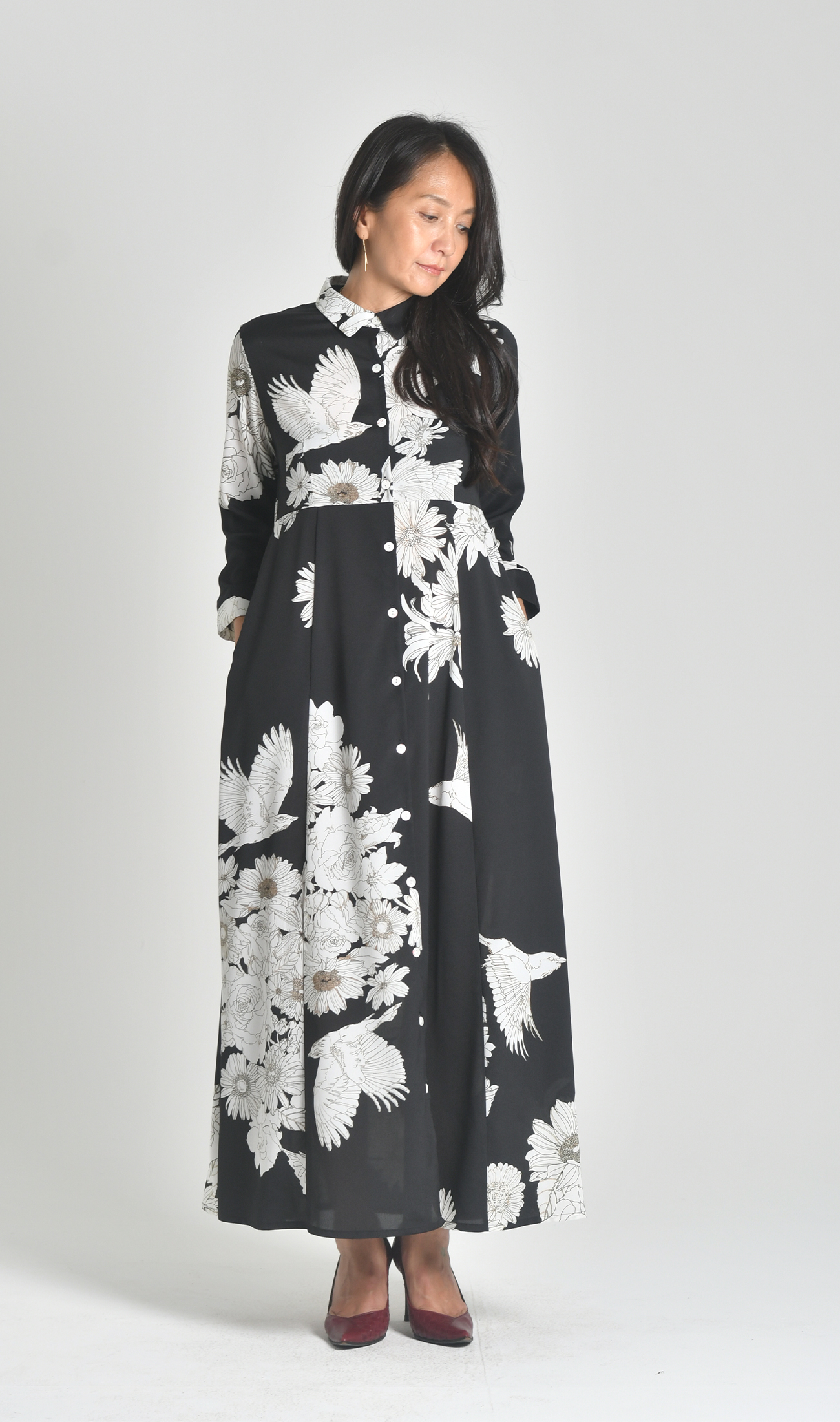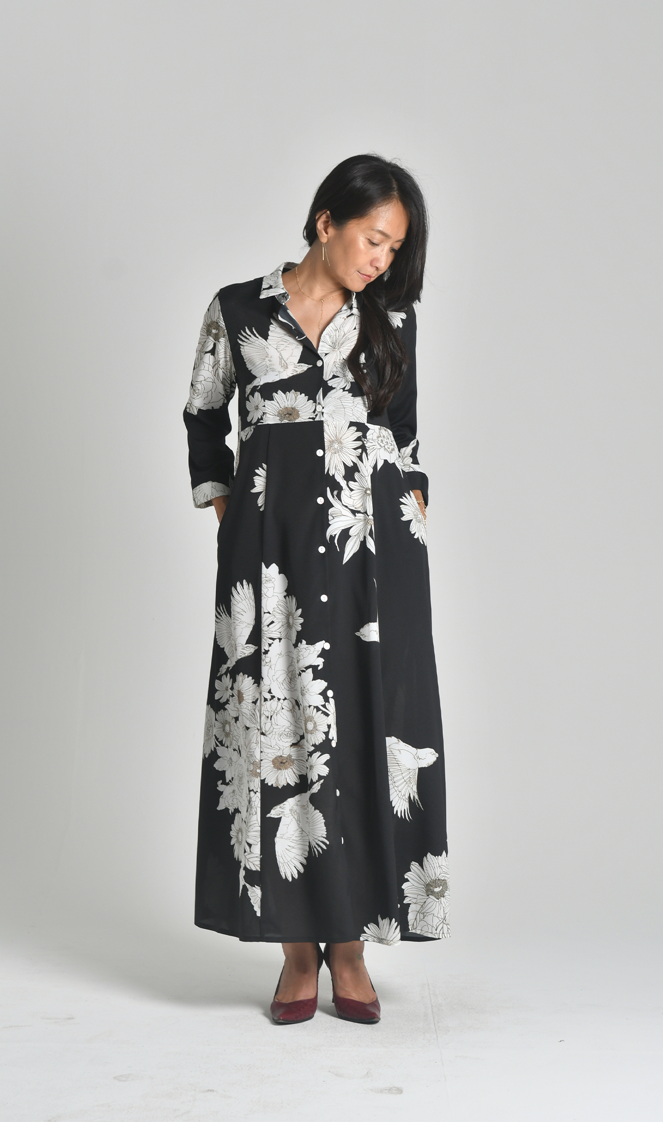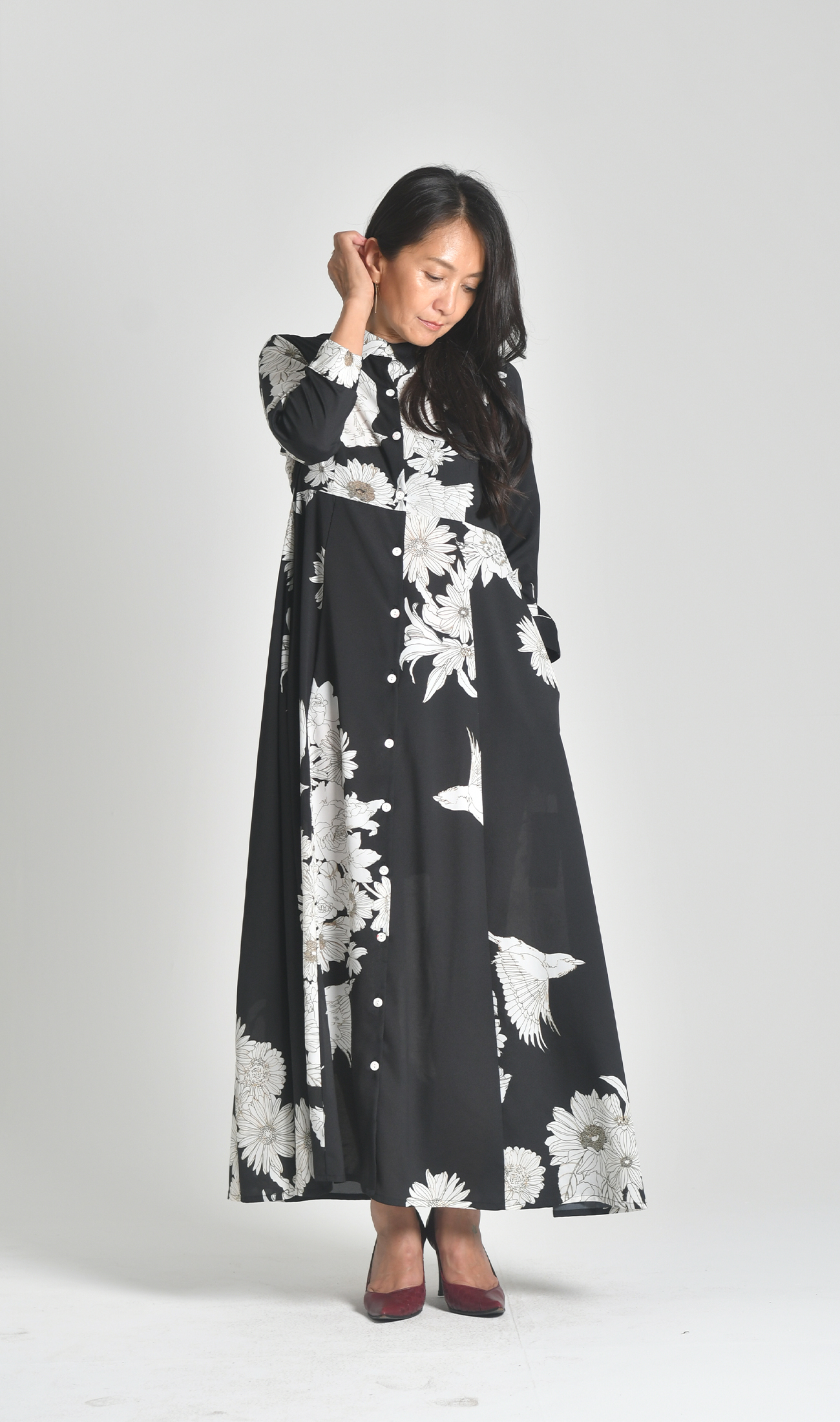 マキシ丈でたっぷりのテキスタイル生地を使用したフレアラインは