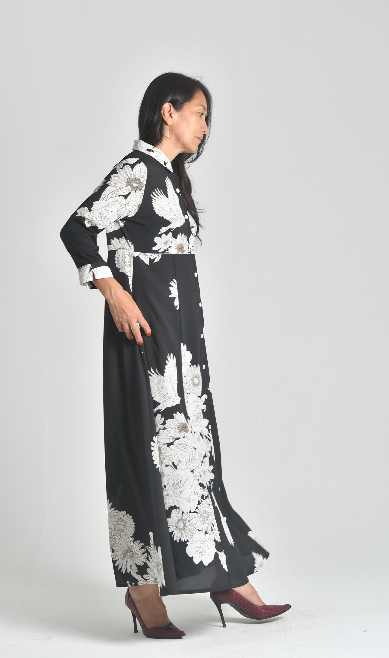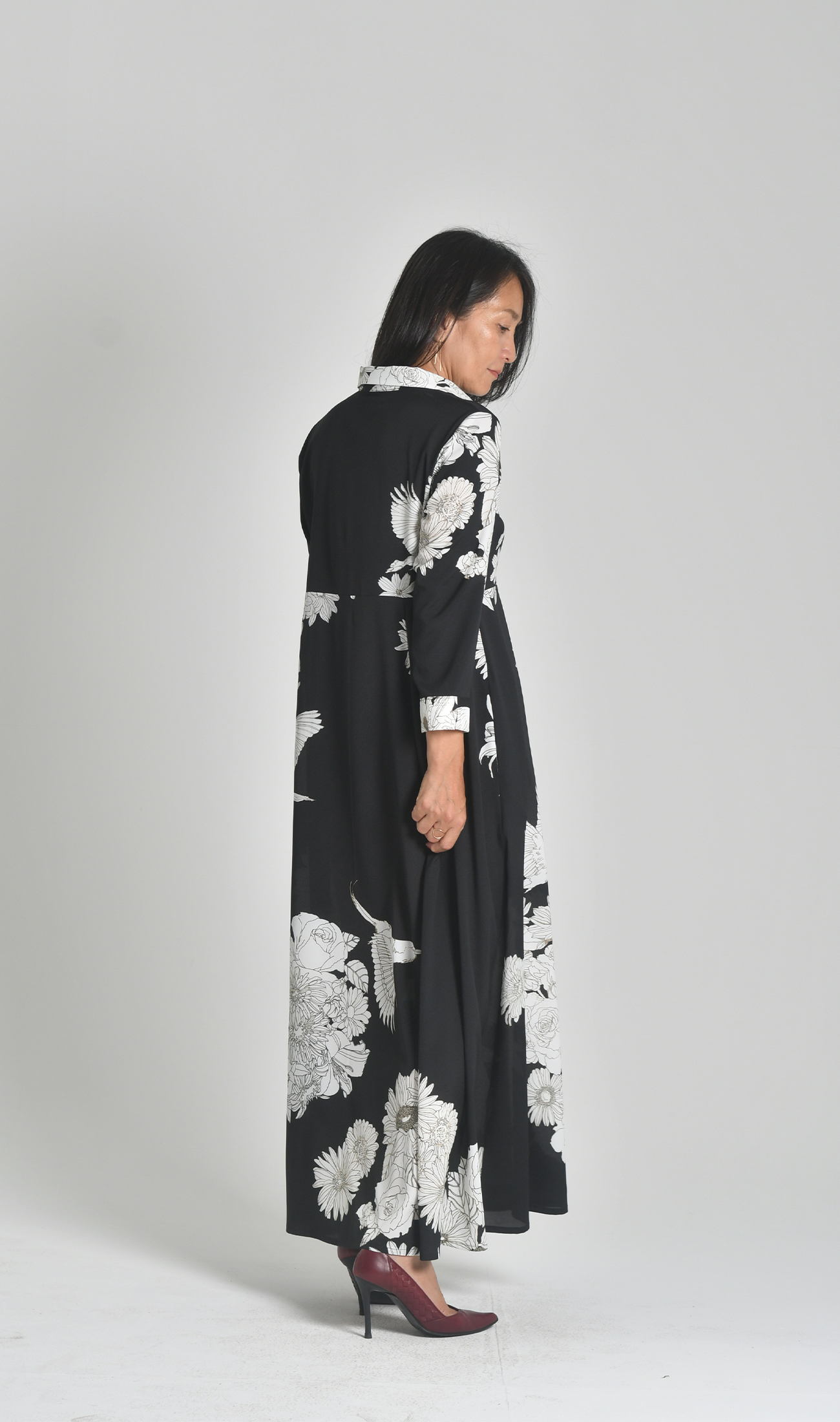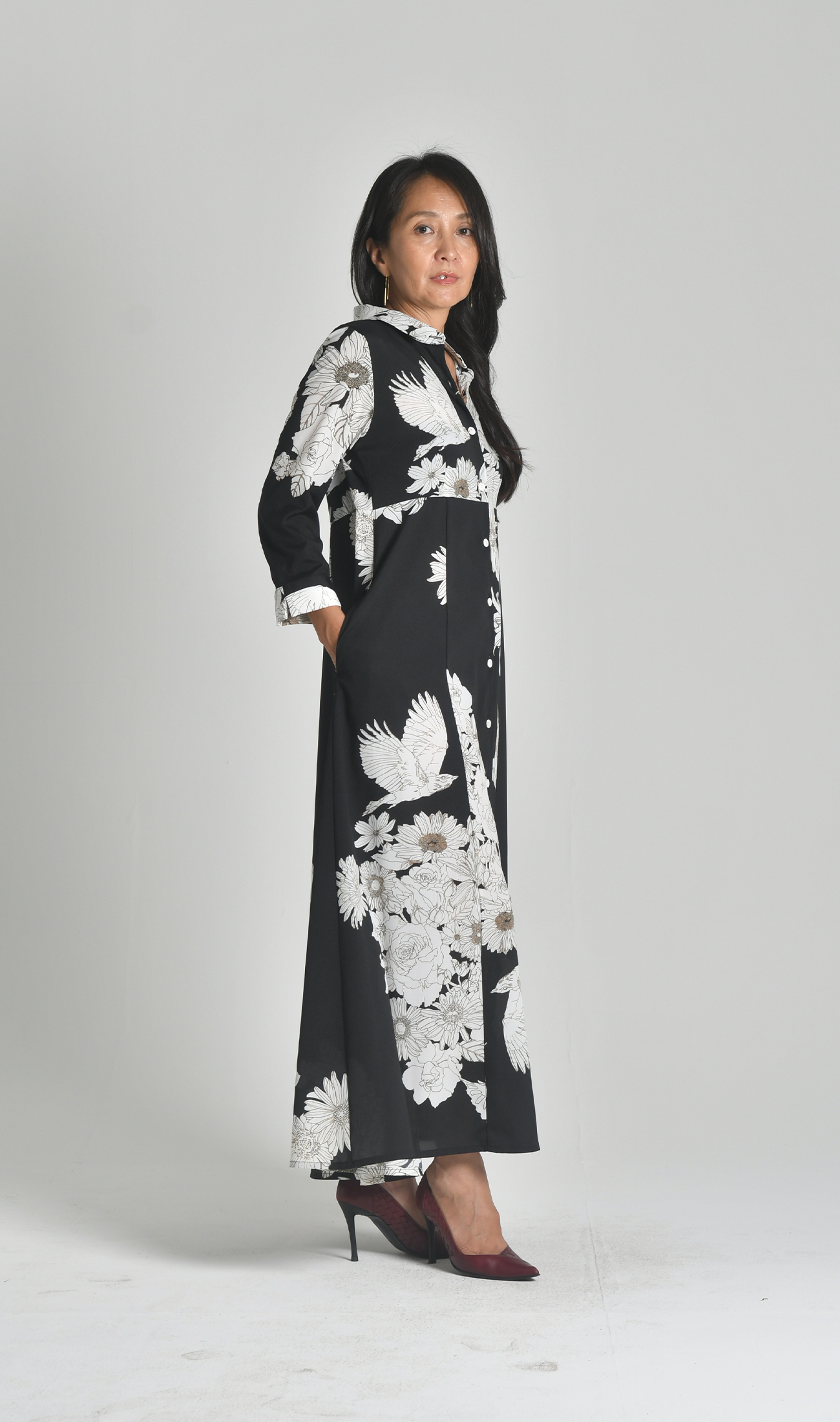 マキシ丈でたっぷりのテキスタイル生地を使用したフレアラインは