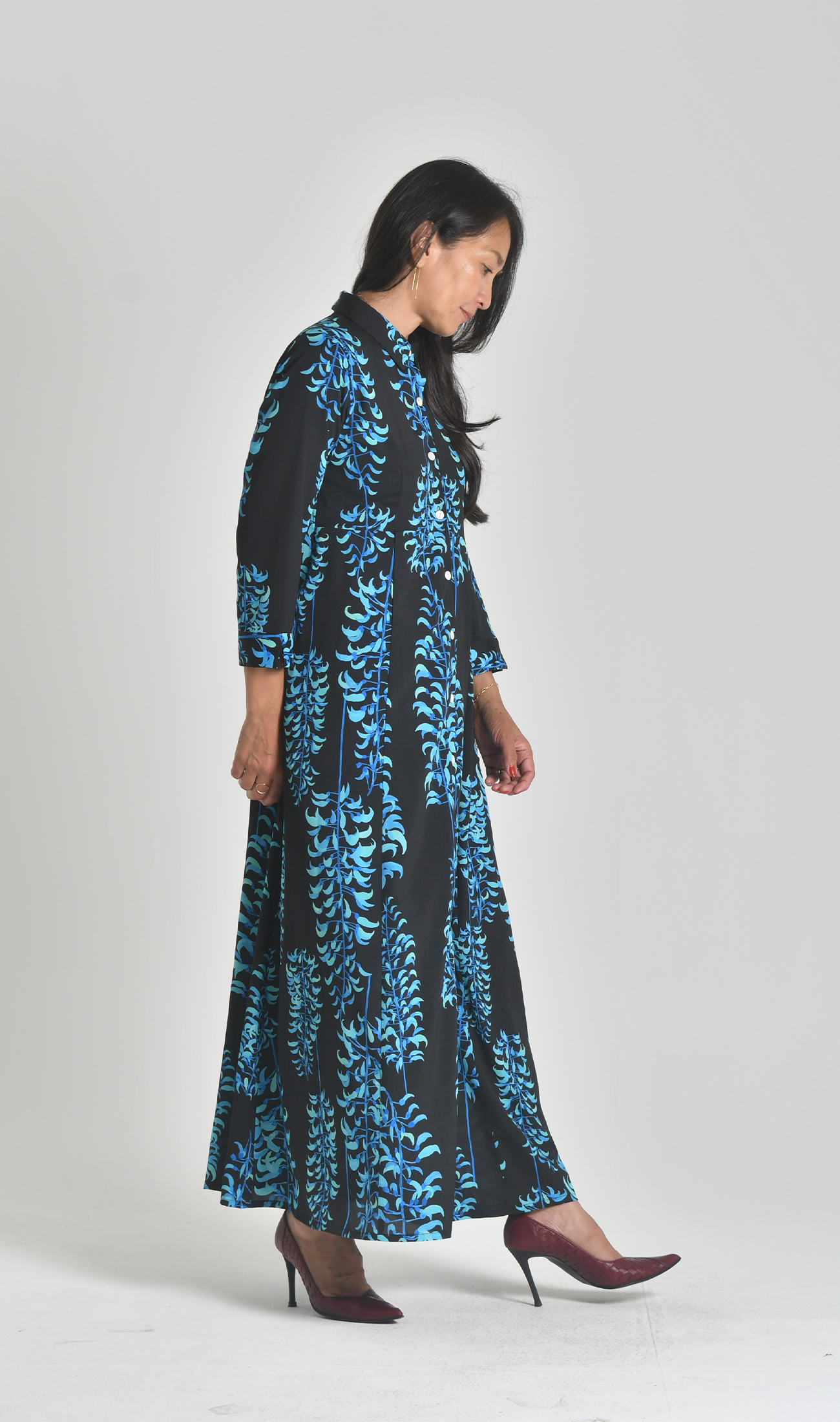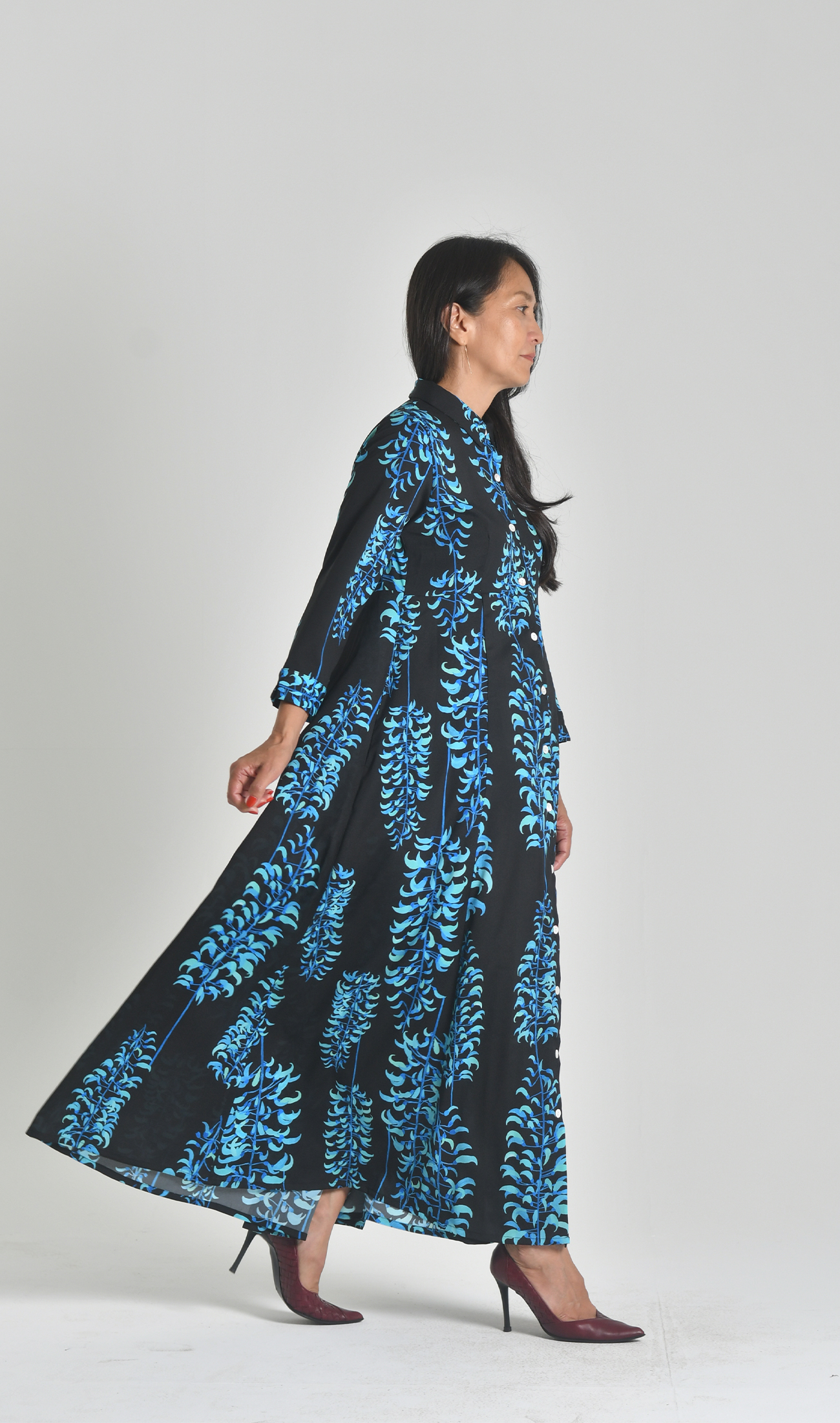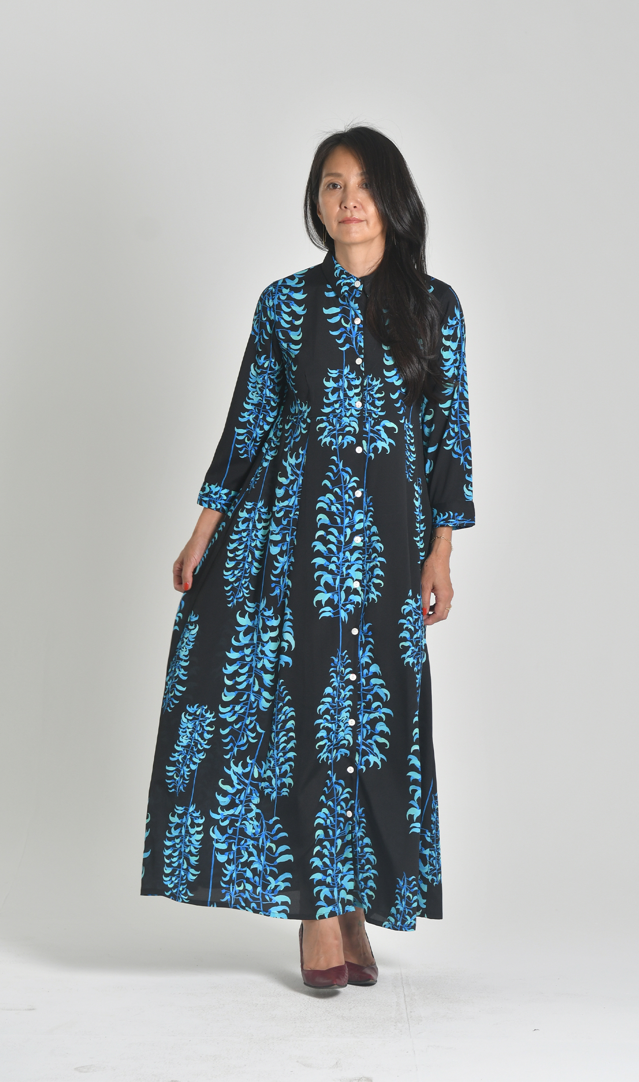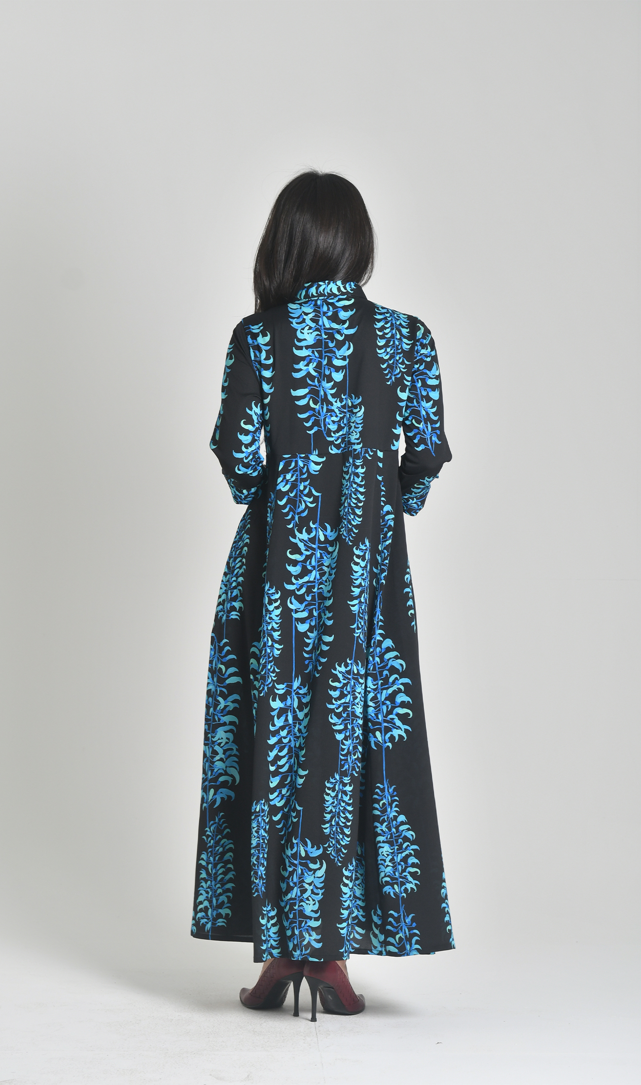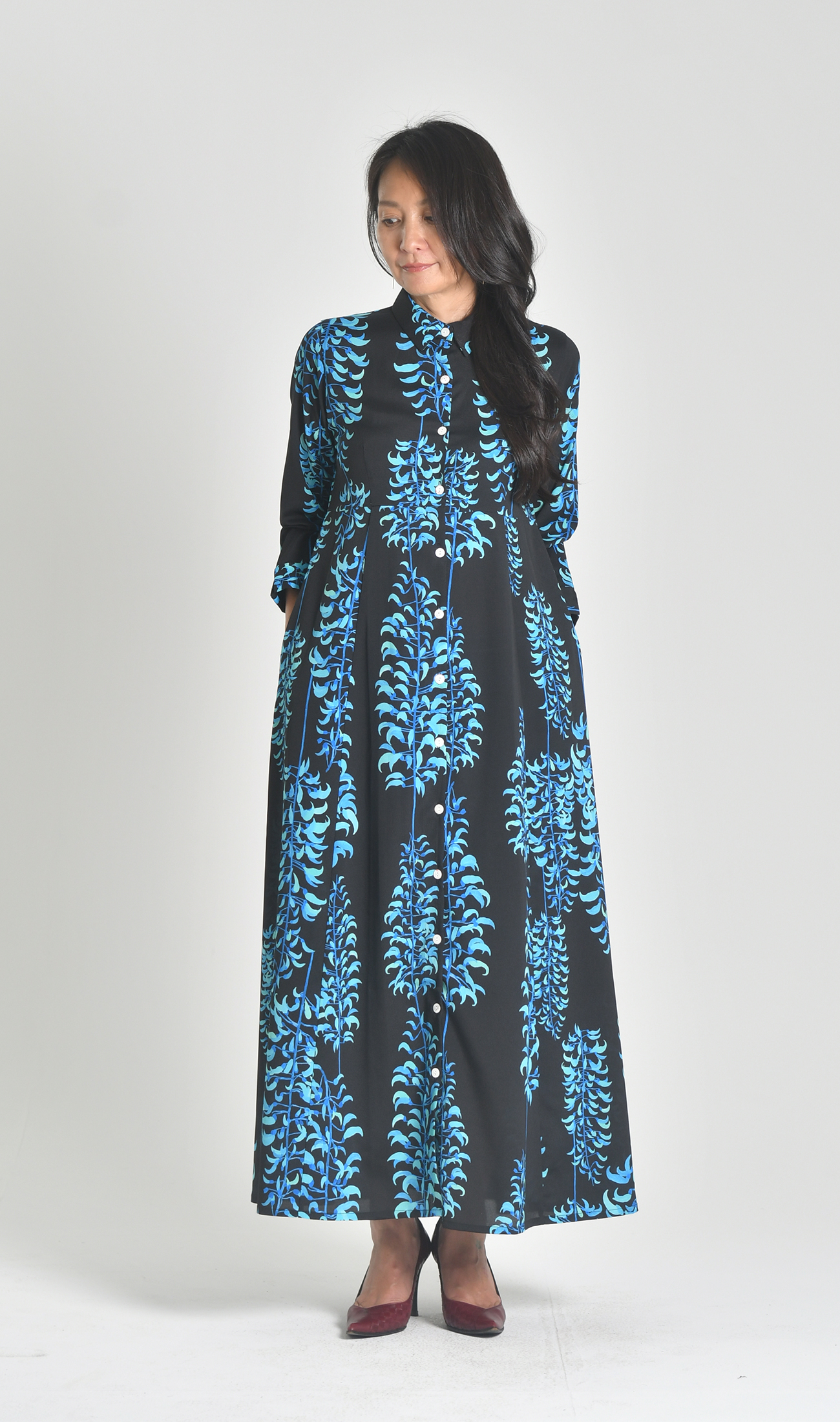 マキシ丈でたっぷりのテキスタイル生地を使用したフレアラインは