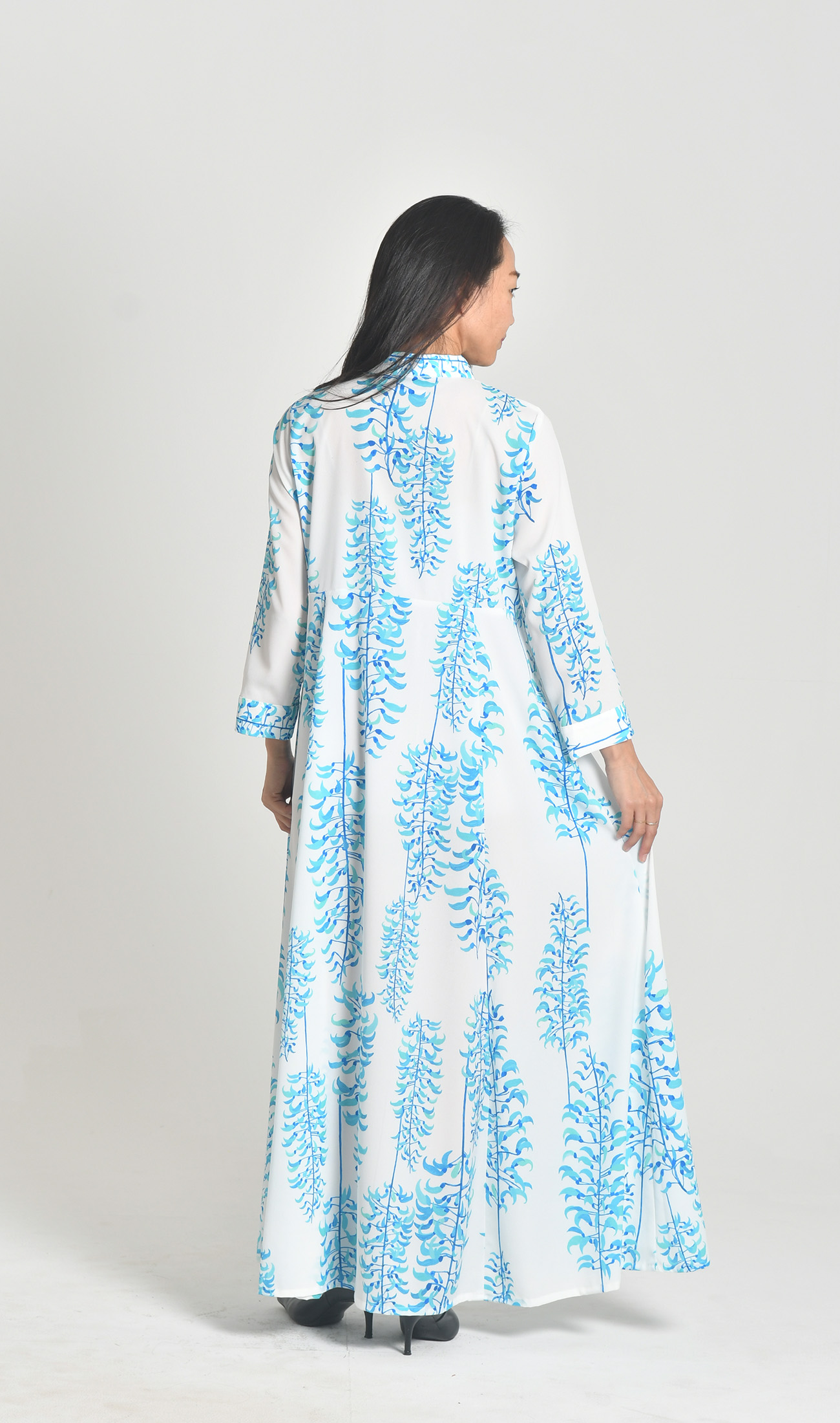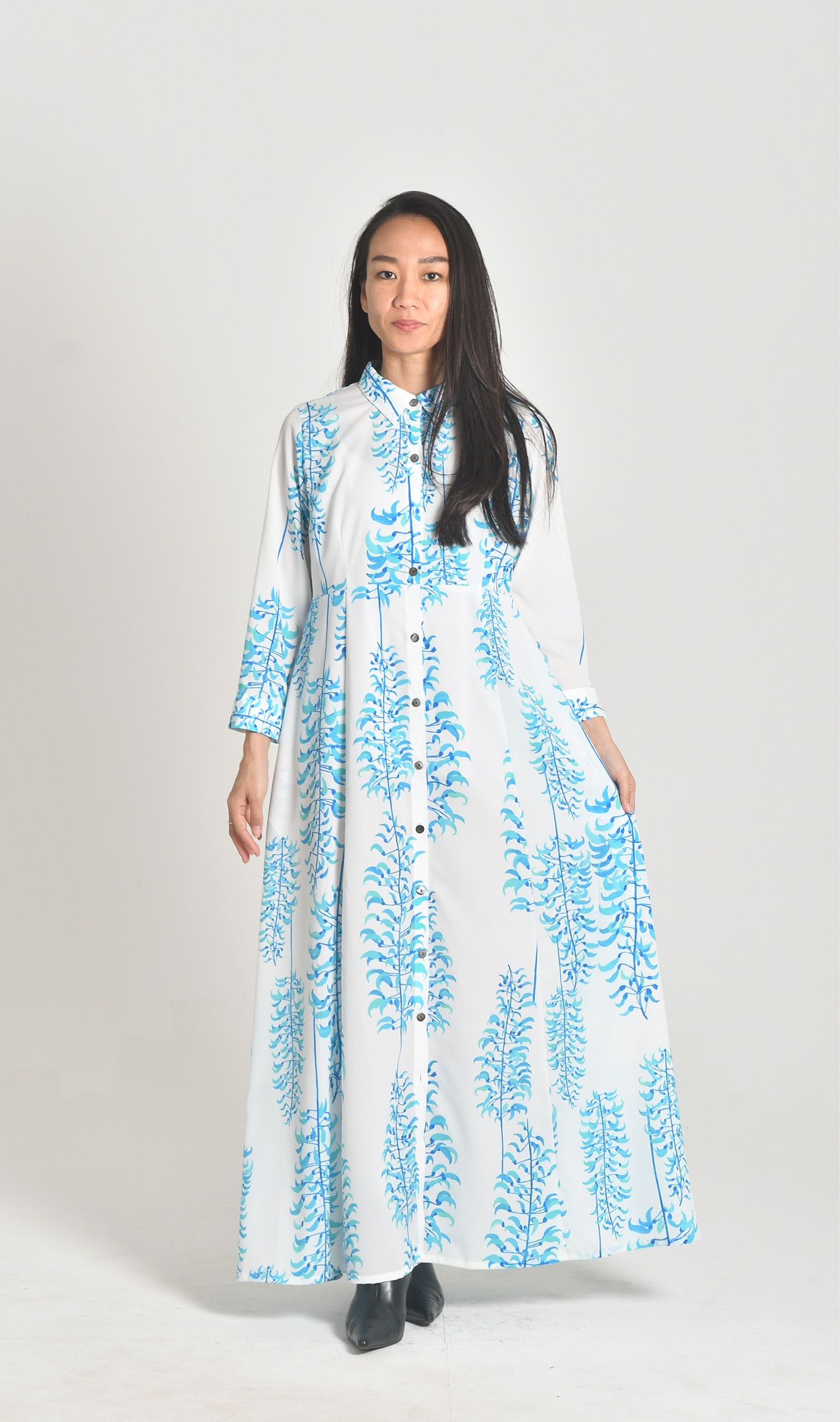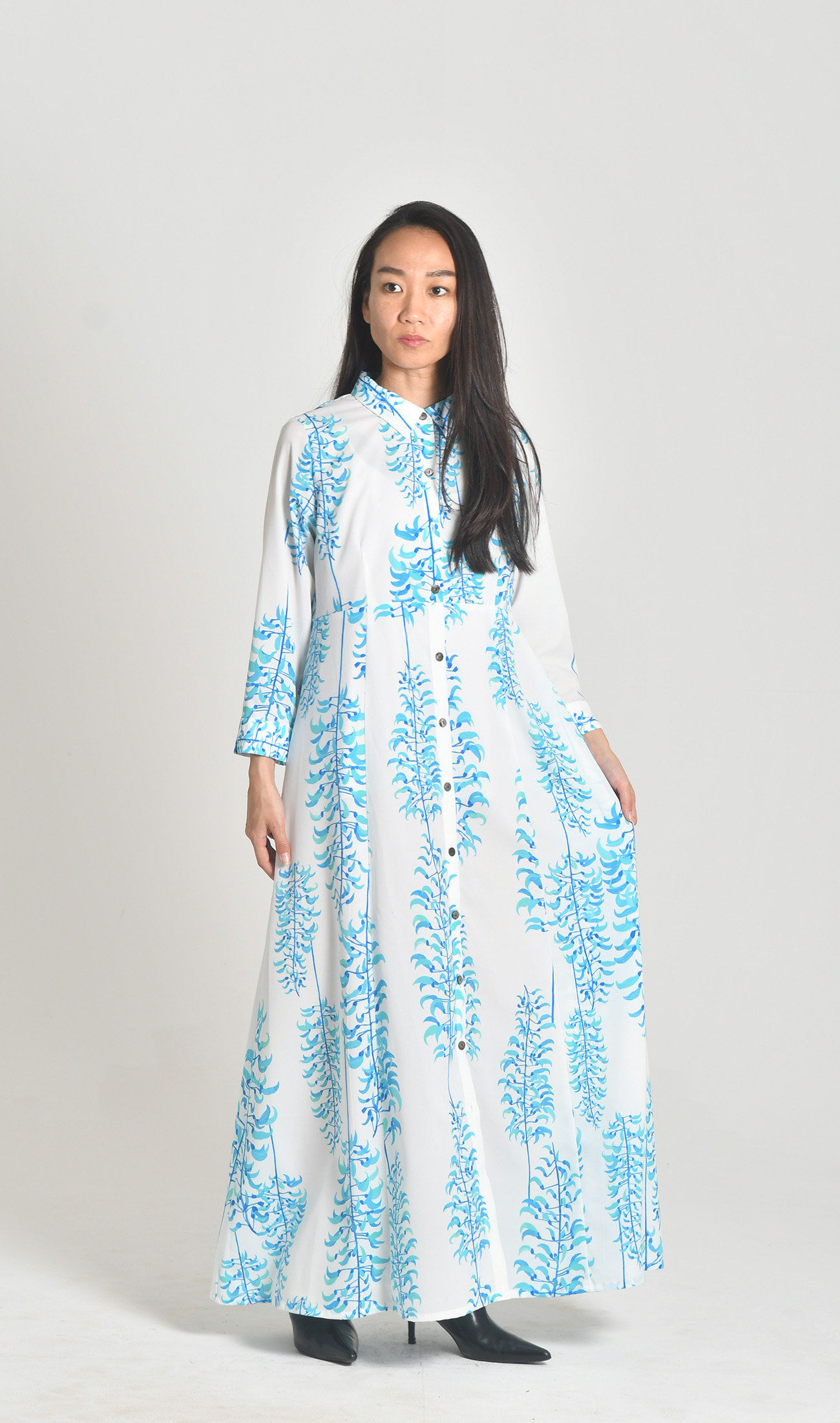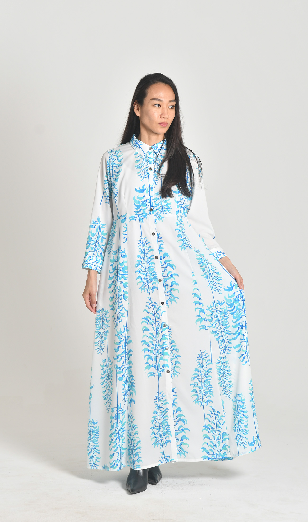 マキシ丈でたっぷりのテキスタイル生地を使用したフレアラインは