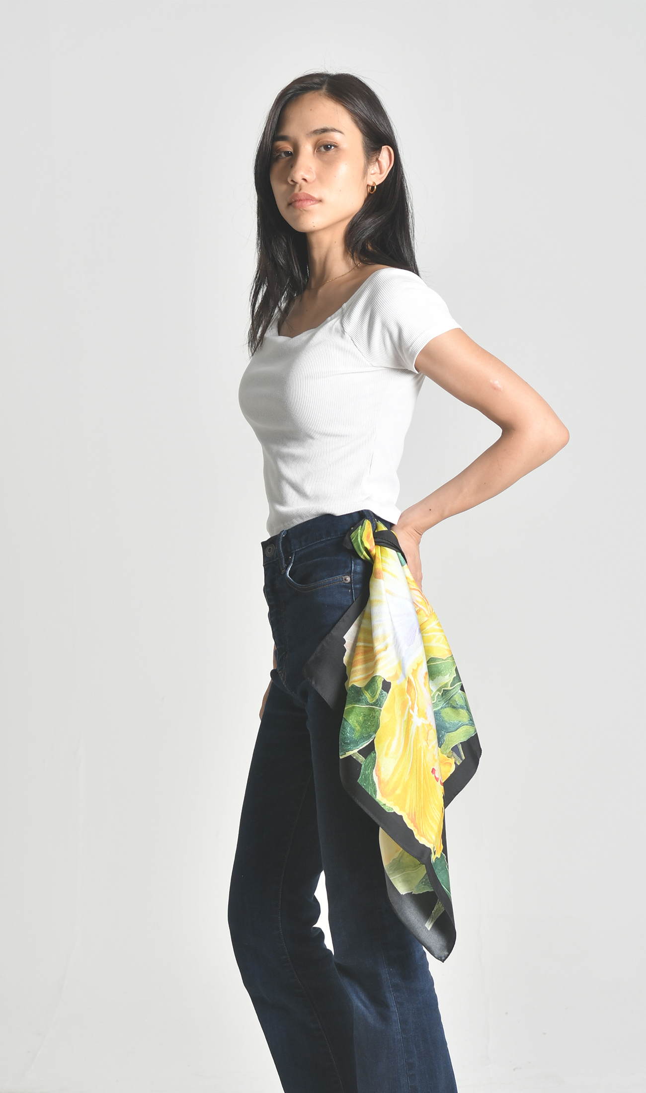 54cm 正方形 で、首元やバックにさっと結ぶだけで華やかなアクセントに。