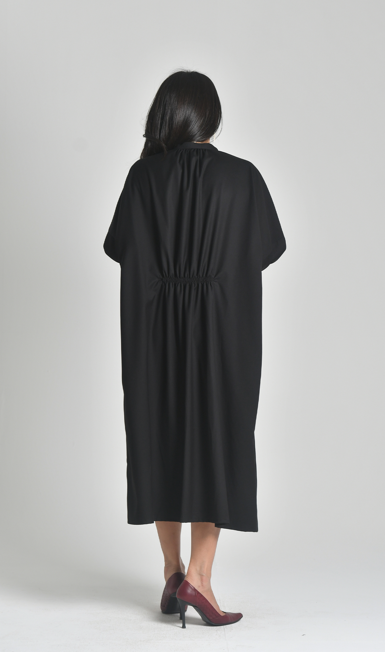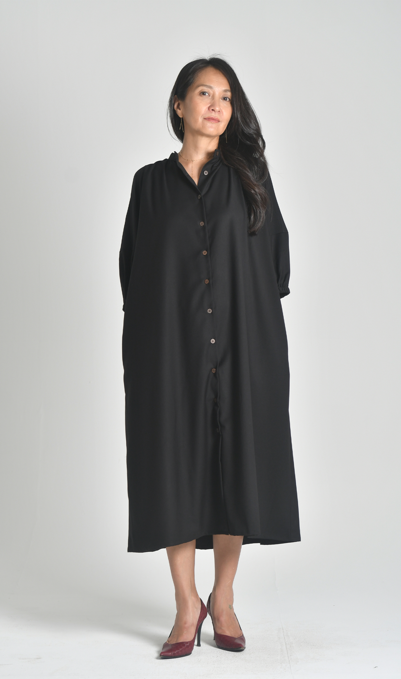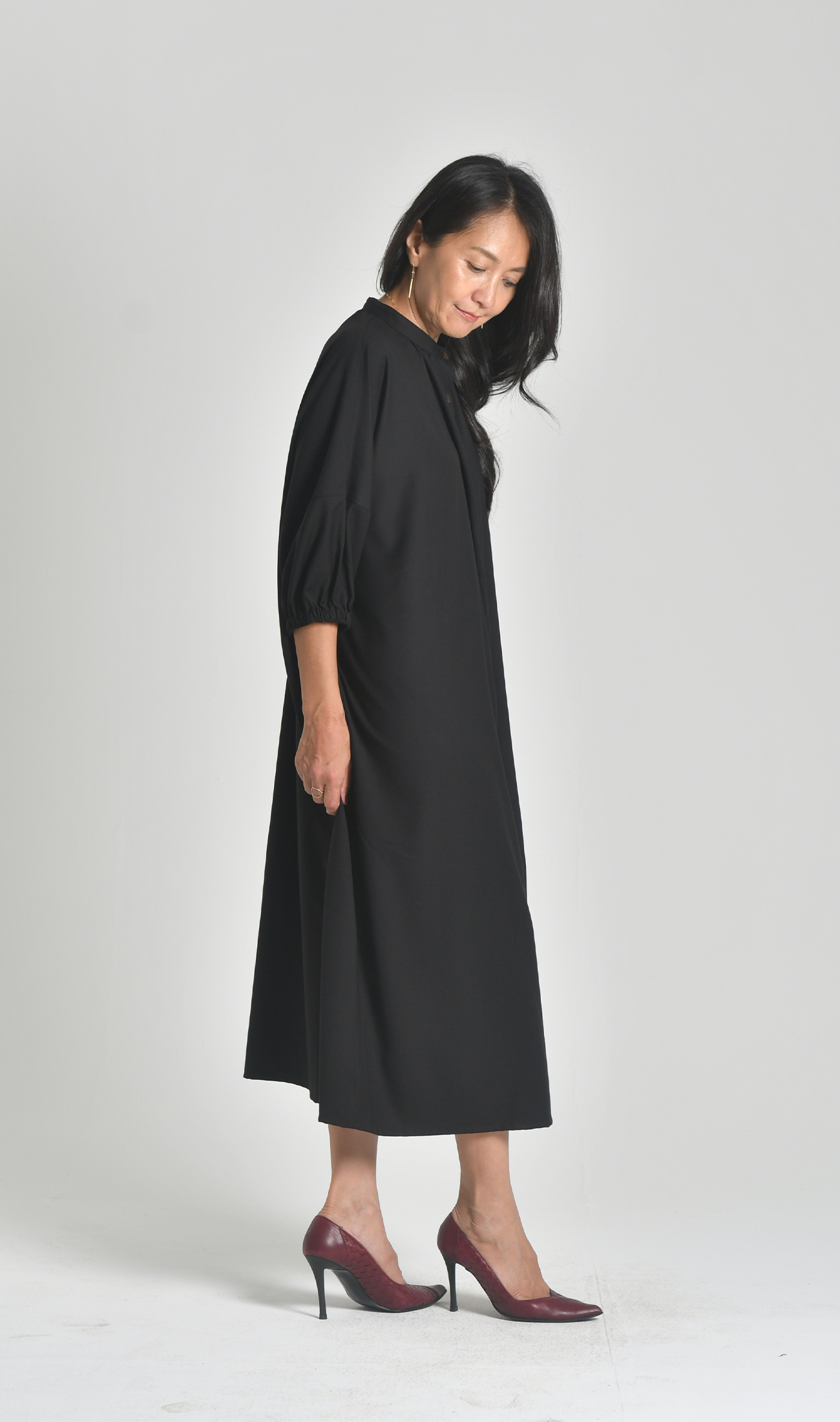 袖口の広いドルマンスリーブでゆったりめなサイズ感、ウエストマークを絞るとスッキリと細めのシルエットでもお召し頂けます。