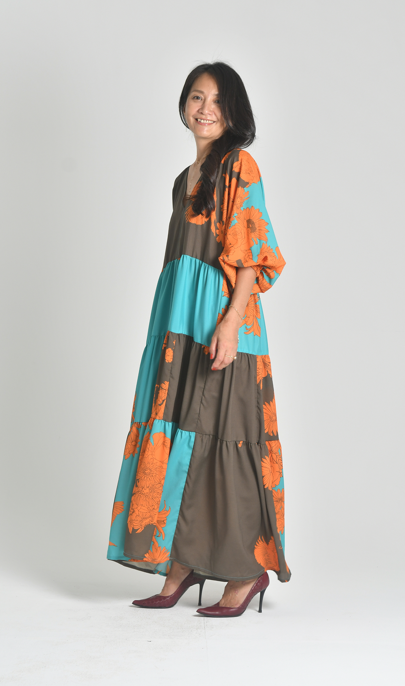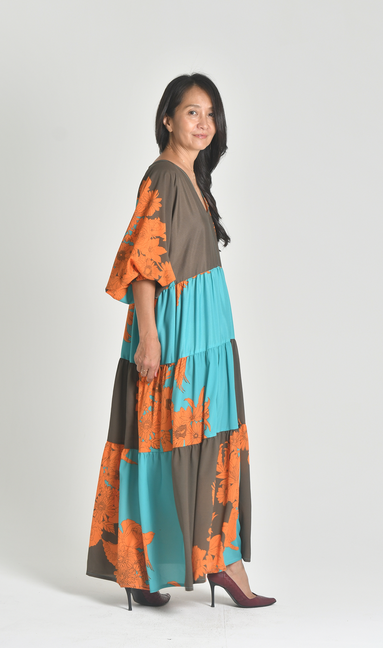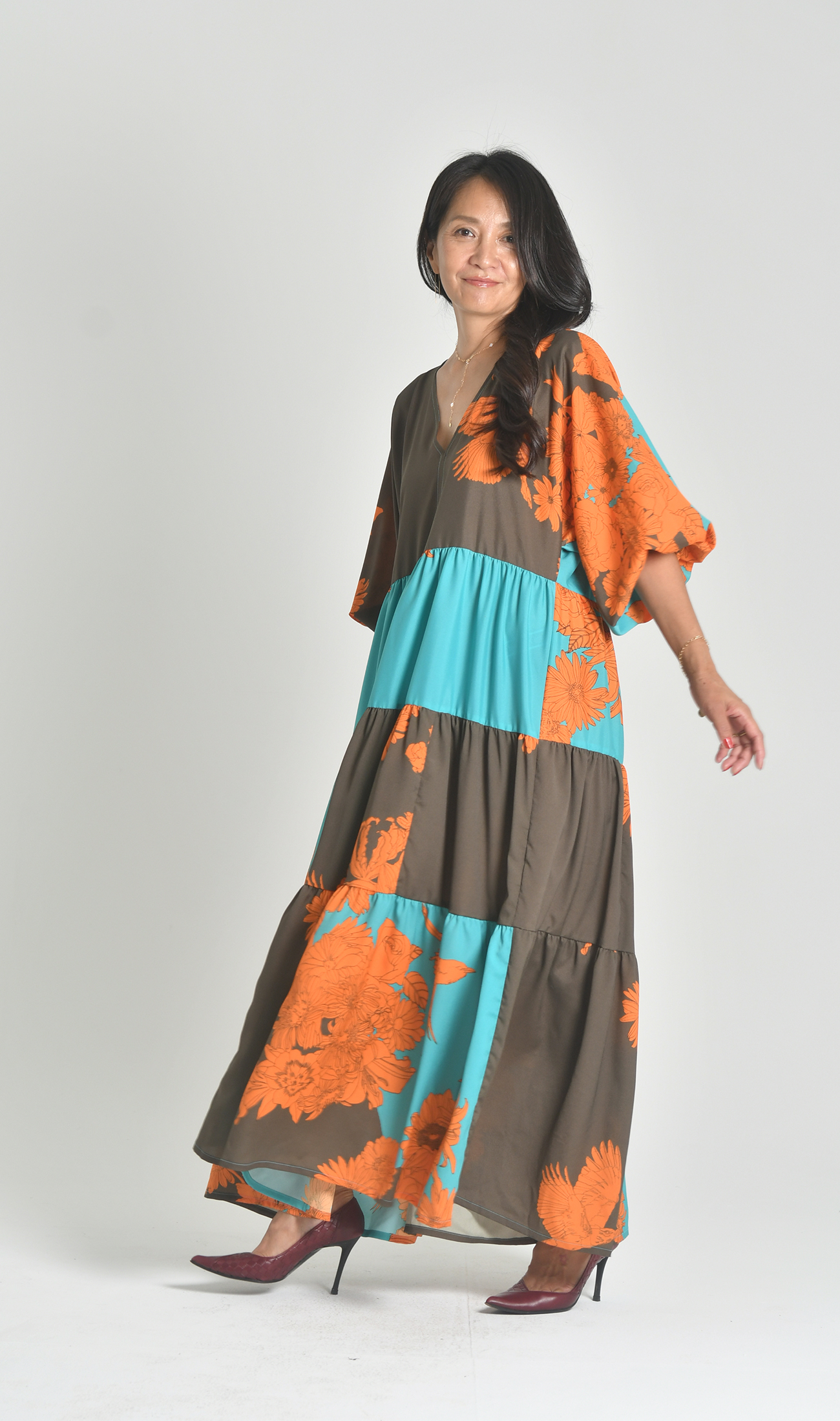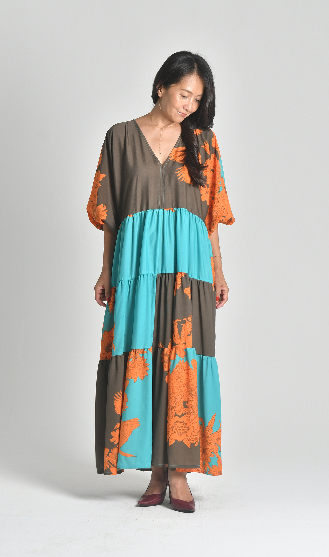 生地をふんだんに使用したティアードのデザインで、風になびくとふんわり素敵なシルエットですが、シフォン素材で広がりすぎず大人の方にもおすすめのティアードワンピースです。