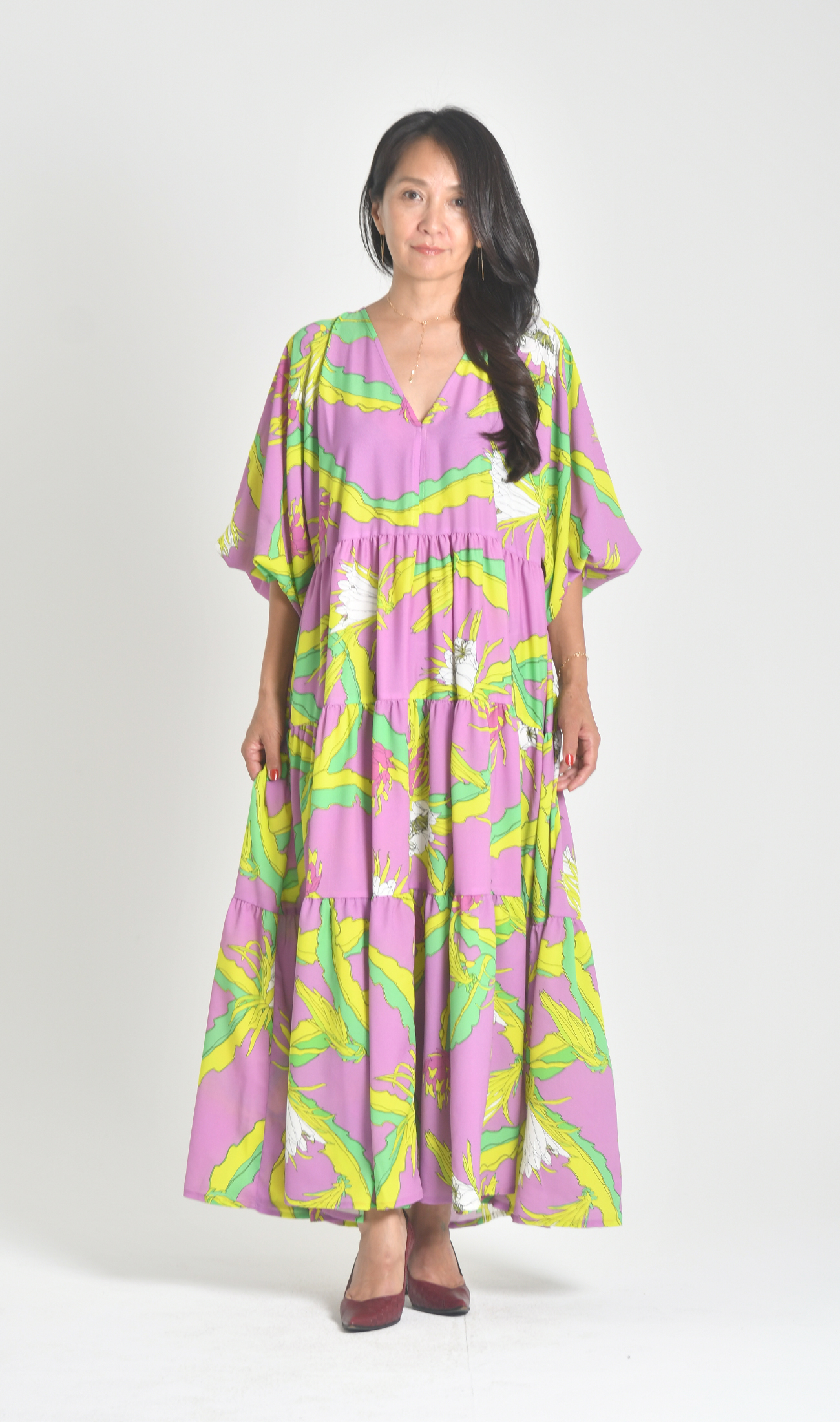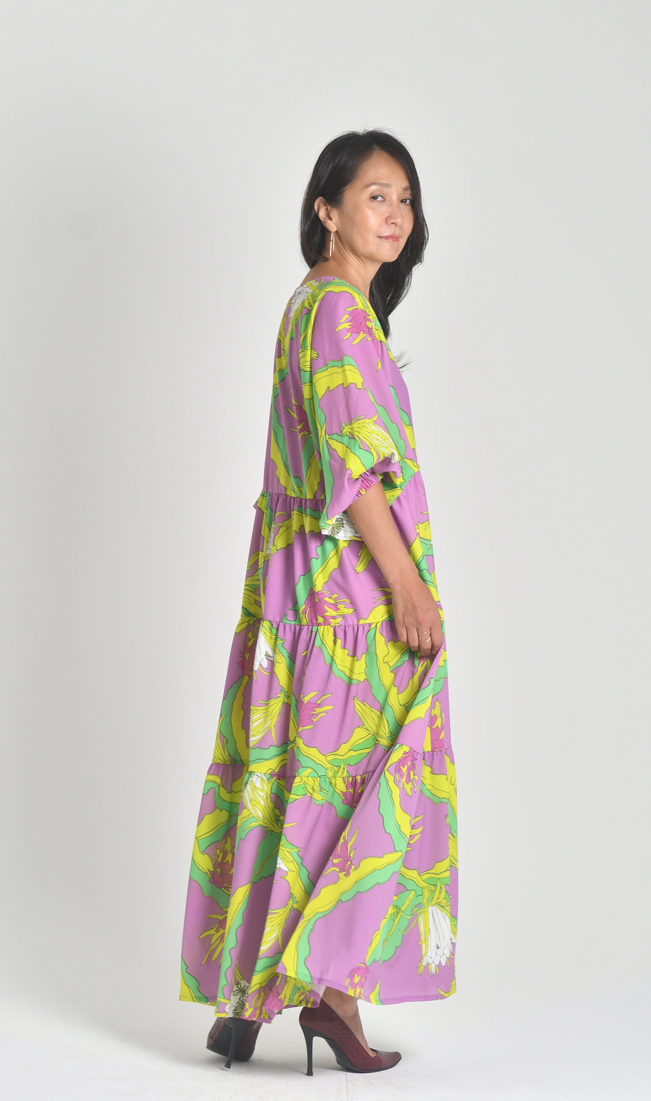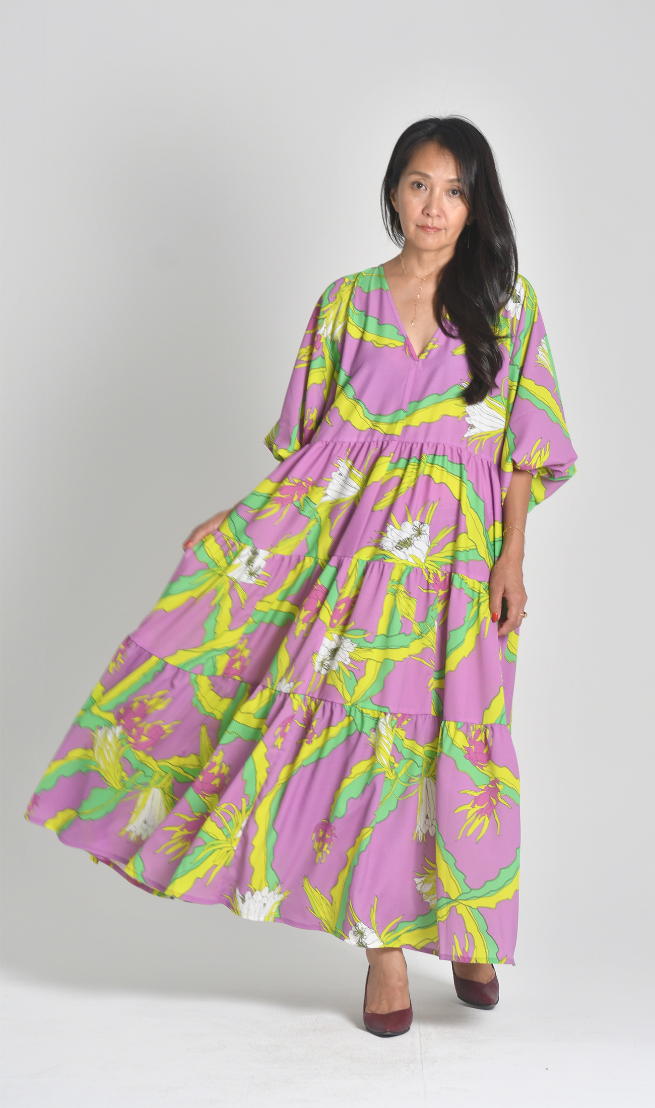 生地をふんだんに使用したティアードのデザインで、風になびくとふんわり素敵なシルエットですが、シフォン素材で広がりすぎず大人の方にもおすすめのティアードワンピースです。