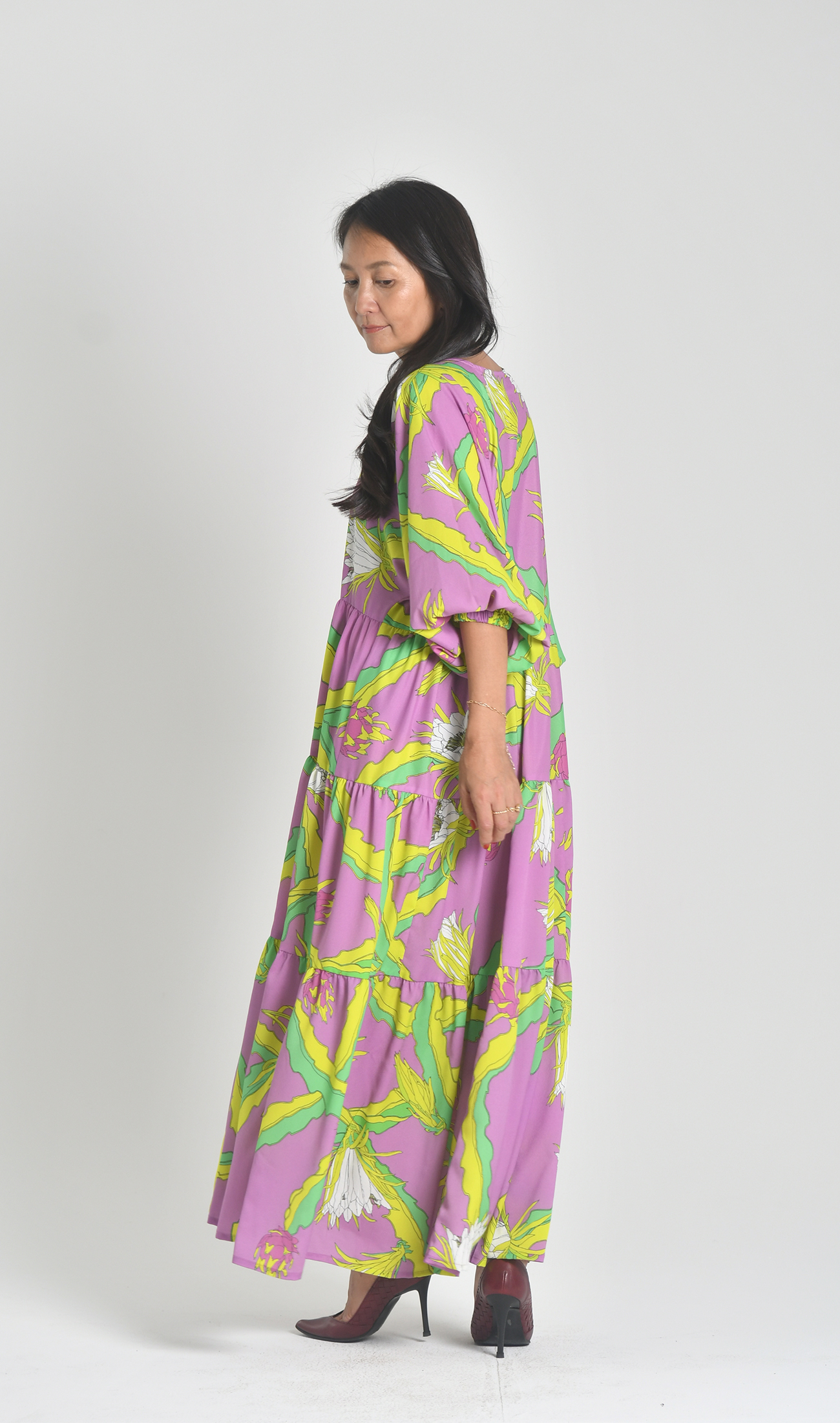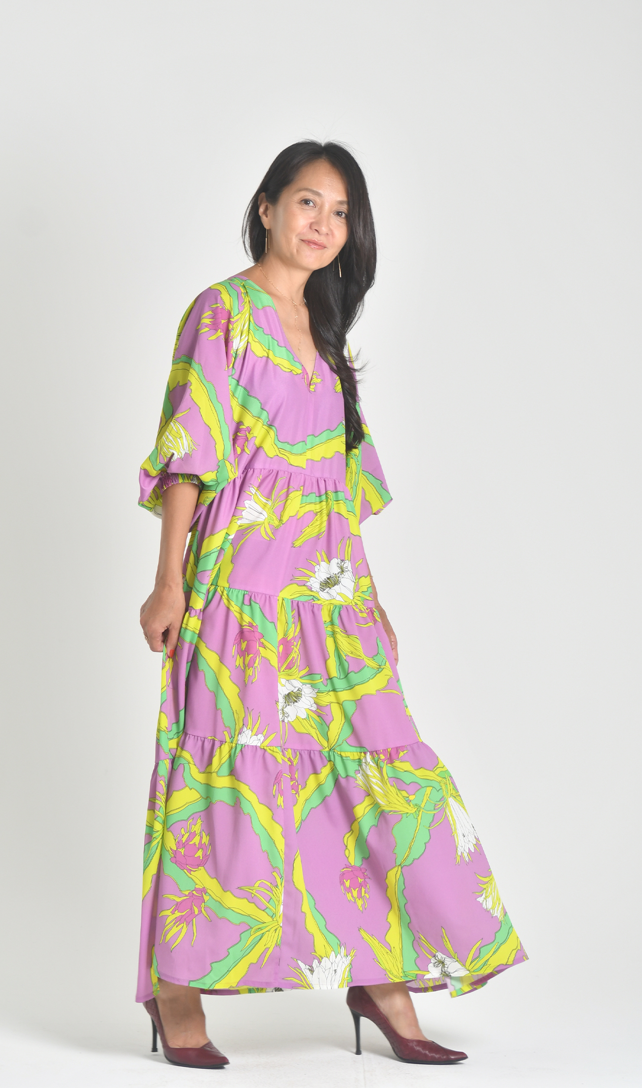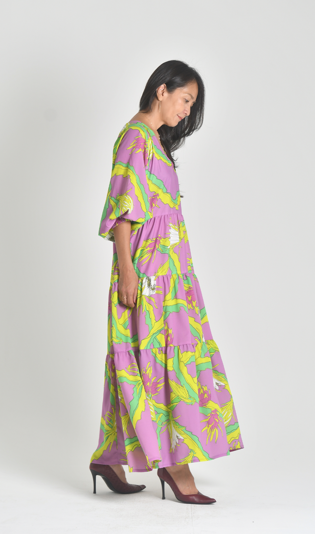 生地をふんだんに使用したティアードのデザインで、風になびくとふんわり素敵なシルエットですが、シフォン素材で広がりすぎず大人の方にもおすすめのティアードワンピースです。